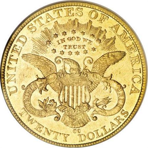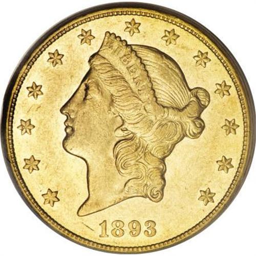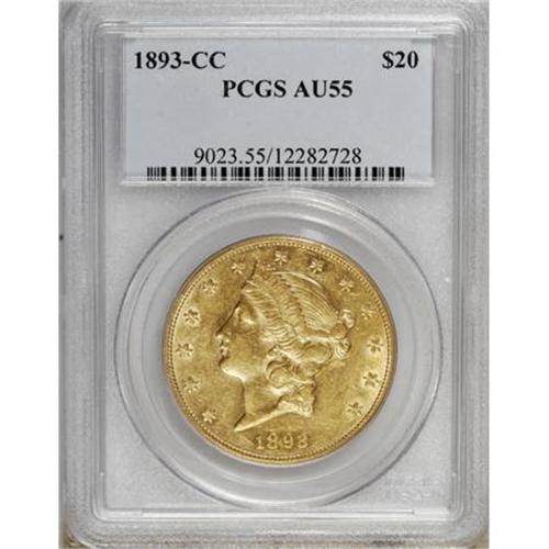 <B>1893-CC $20 AU55 PCGS.</B></I> Despite the small mintage, numerous small hoard discoveries have made this issue, the last gasp of the Carson City Mint, available for a price in Mint State. This Choice AU piece displays semiprooflike yellow-gold surfaces with generous appeal, and there are no singular abrasions.<BR><BR><B>Coin Engraver:</B> James B. Longacre<BR><BR><b>Shipping:</b> Coins & Currency (<a target="_blank" href="http://www.heritageauctions.com/common/shipping.php">view shipping information</a>)
