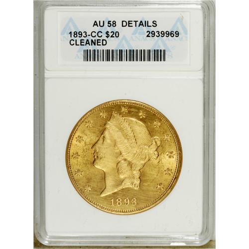 <B>1893-CC $20 --Cleaned--ANACS. AU58 Details.</B></I> This low mintage Carson City twenty has rich orange toning and full cartwheel luster. Both sides are thickly hairlined, but substantial eye appeal remains.<BR><BR><b>Shipping:</b> Coins & Currency (<a target="_blank" href="http://www.heritageauctions.com/common/shipping.php">view shipping information</a>)