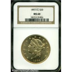 1893-CC $20 MS60 NGC. Very sharply struck, especia <B>1893-CC $20 MS60 NGC.</B></I> Very sharply struck, especially in the centers, the mint luster is fully intact and the surfaces overall have a light, copper-yellow tint. Sure to be of interest to collectors both as a Mint State Carson City type coin and as the final issue from this historic mint. <BR><BR><B>Important notice:</B> Heritage usually auctions material at the rate of 200-250 lots per hour. On some occasions eBay Live bid software or the Internet may not be able to keep up with the pace of the auction. We recommend placing a realistic absentee bid now as insurance to avoid disappointment. Occasionally the auctioneer may eliminate or reject an eBay Live bid, and the auctioneer may also reopen a lot after the close of the eBay live bidding (usually because we missed an audience bid), and may reject your bid even if it shows you as the winning bidder. By bidding via eBay Live, you agree that Heritage may award the lot to another bidder at its sole discretion under the circumstances described above or any other reasonable circumstances. Since eBay bids are not shown to us until we open the lot on the floor, we treat those bids just like floor bids. In most cases the floor responds before the eBay bid is presented to us, due to Internet lag time, so for consistency we have made it a policy that floor bids are always considered first over tie eBay live bids. Also please note that all Heritage lots purchased through eBay Live carry a 20% Buyer's Premium. Please make sure you read the Terms and Conditions before you bid. This lot is being auctioned in conjunction with a live floor auction by Heritage Galleries & Auctioneers. All final auction and invoice information will be supplied by Heritage Galleries & Auctioneers, and all other information should be considered preliminary. Lot:6956
