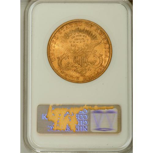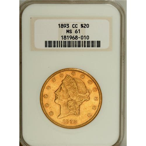 <B>1893-CC $20 MS61 NGC.</B></I> A solidly struck and appealing example from the final year of the Carson City Mint. The fields, yellow-gold with pretty copper and jade accents, have strong luster. In addition, the portrait displays a hint of frost. Though numerous light abrasions appear on each side, the overall eye appeal suggests a higher grade.<BR><BR><b>Shipping:</b> Coin/Currency (<a target="_blank" href="http://www.heritageauctions.com/common/shipping.php">view shipping information</a>)