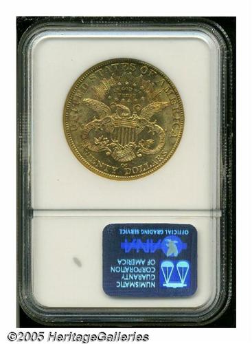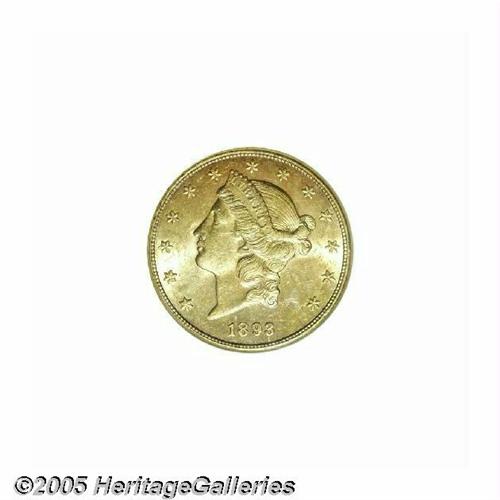 <B>1893-CC<$20> MS61 NGC.</B></I> A very attractive example for such a modest Uncirculated grade, with eye appealing peripheral patina and no singularly distracting surface marks. The 1893-CC, while struck in modest numbers (18,402 pieces), can be obtained fairly readily in grades up to MS61, but seldom finer.
