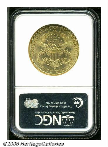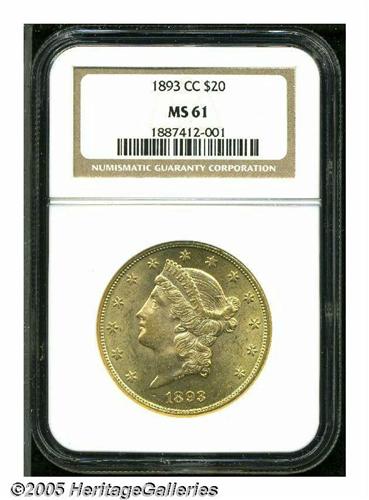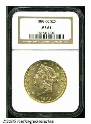 <B>1893-CC<$20> MS61 NGC.</B></I> Popular as the final year of issue rather than as a rarity in the CC series, the 1893-CC is also one of the few issues that is locatable and affordable in mint condition. This sharply struck example has bright, satiny fields with very little of the reddish patina that is usually seen on this issue.