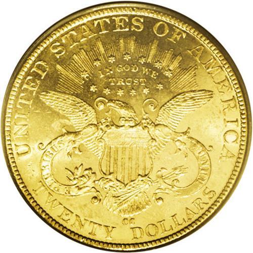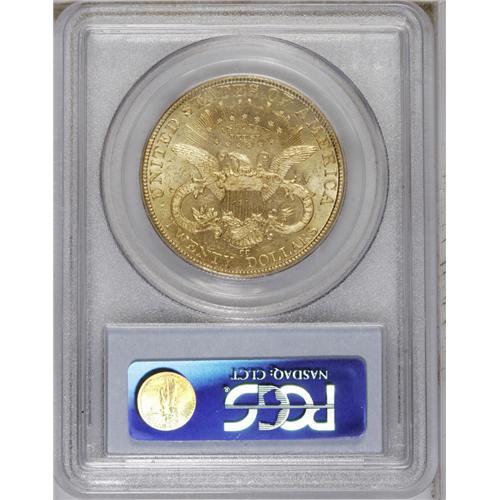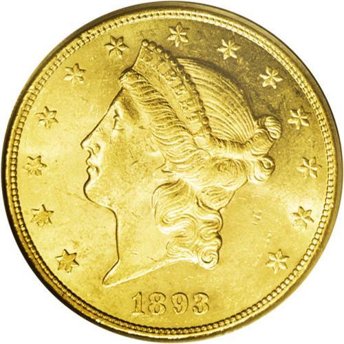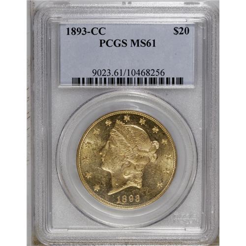 <B>1893-CC<$20> MS61 PCGS.</B></I> The low mintage of a bit more than 18,000 pieces was the finale of the Carson City double eagle coinage. For that reason, likely a few more pieces were saved (this was also the year that Augustus Heaton's seminal mintmark work was published). The present example offers near-prooflike surfaces, with beaming luster and contact marks consistent with an MS62 grade.