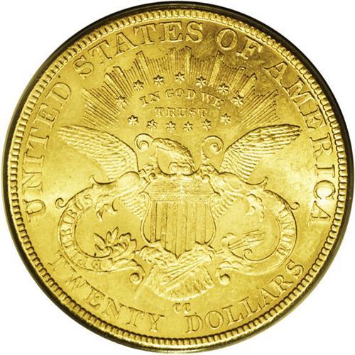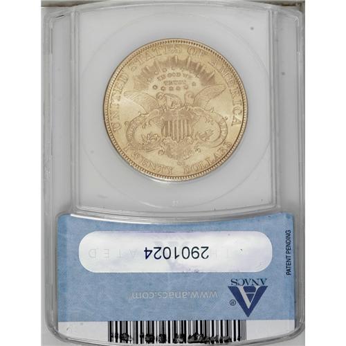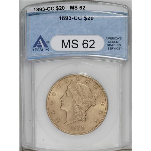 <B>1893-CC<$20> MS62 ANACS.</B></I> Well detailed on all of the design elements, as well as the denticles, this pleasing Mint State representative displays even lime-gold toning over both sides. The surfaces are minimally abraded for the grade, but the satin luster seems a bit weak. The final double eagle issue from the Carson City Mint, and exceedingly scarce at grade levels above MS62.