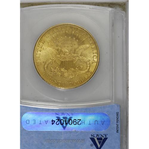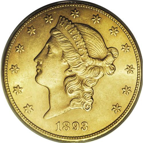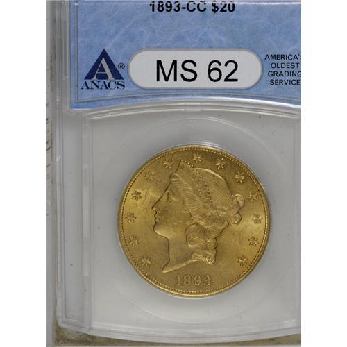 <B>1893-CC $20 MS62 ANACS.</B></I> Well detailed on all of the design elements, as well as the denticles, this pleasing Mint State representative displays even lime-gold toning over both sides. The surfaces are minimally abraded for the grade, but the satin luster seems a bit weak. The final double eagle issue from the Carson City Mint, and exceedingly scarce at grade levels above MS62.<BR><BR><b>Shipping:</b> Coin/Currency (<a target="_blank" href="http://www.heritageauctions.com/common/shipping.php">view shipping information</a>)