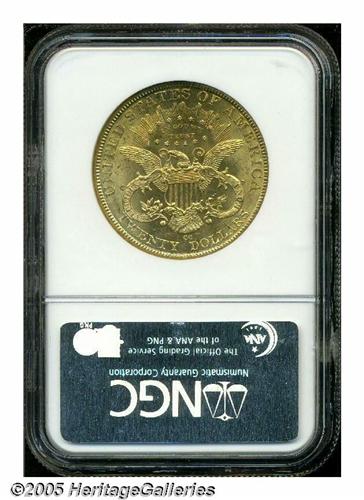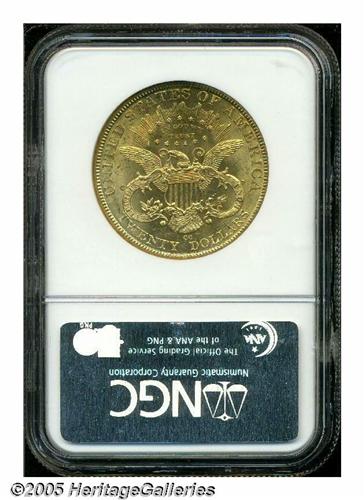 <B>1893-CC<$20> MS62 NGC.</B></I> Very popular as a date, the 1893-CC Twenty sports a low mintage of just 18,402 pieces and is the final year of issue from this popular Nevada mint. Many AU and better '93-CC Double Eagles show varying degrees of prooflikeness, but this frosty specimen is without any reflective qualities. Abrasions seem to be concentrated in the obverse field and the eye appeal for the grade is excellent. Population: 91 in 62, 20 finer (4/05).
