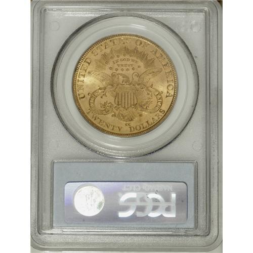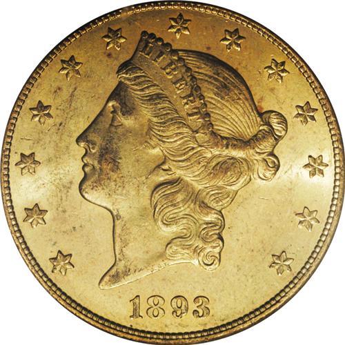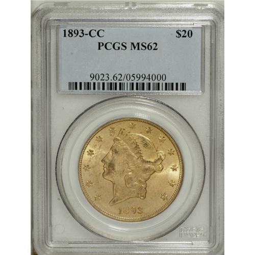 <B>1893-CC $20 MS62 PCGS.</B></I> The decision to close the Carson City Mint after the production of 1893 coinage may have been initiated by the dismal outlook for the production of silver dollars over the short term or perhaps greater cost effectiveness and ease in shipping gold ore to the Philadelphia Mint. In any case, Mint State survivors from this popular final year of issue, while not particularly rare, enjoy extraordinary demand from 21st century collectors. This wholly original example is typically bold and well frosted beneath uniform reddish patina. Shallow facial marks are the primary deterrent to a higher grade.<BR><BR><b>Shipping:</b> Coin/Currency (<a target="_blank" href="http://www.heritageauctions.com/common/shipping.php">view shipping information</a>)