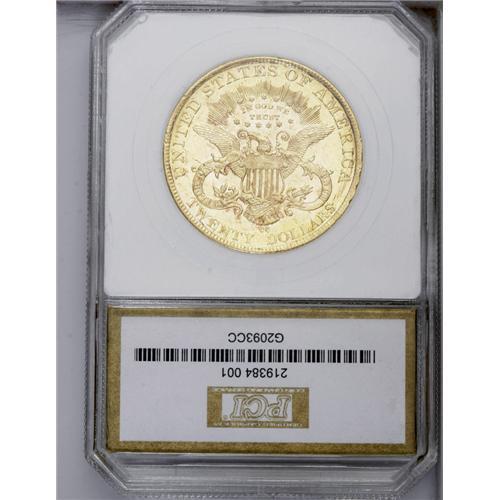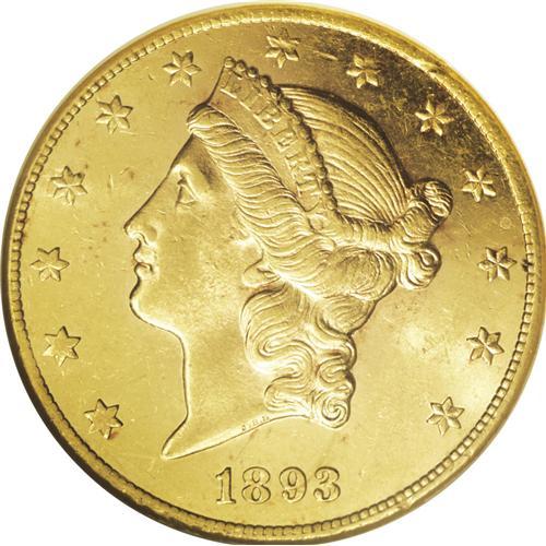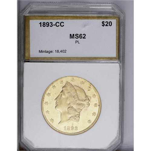 <B>1893-CC<$20> MS62 Prooflike PCI.</B></I> Although only 18,402 1893-CC double eagles were reported struck (a limited number, even by the standards of this particular branch mint), this issue is among the more easily obtainable CC-mint Twenties in high grades. Uncirculated survivors are rarer than only those of the 1875-CC, 1884-CC, and 1890-CC productions. Advanced type collectors should enjoy bidding on this rare prooflike, yellow-gold representative. Scattered tiny abrasions account for the grade, but the sharply defined surfaces have eye appeal to spare. An always-popular issue from the final year of coinage operations at the Carson City mint, and an exceedingly difficult coin with prooflike fields.<BR><I>From The New York Eye Appeal Collection.</B></I>