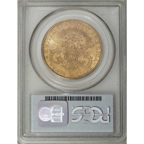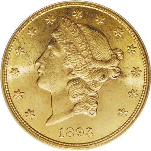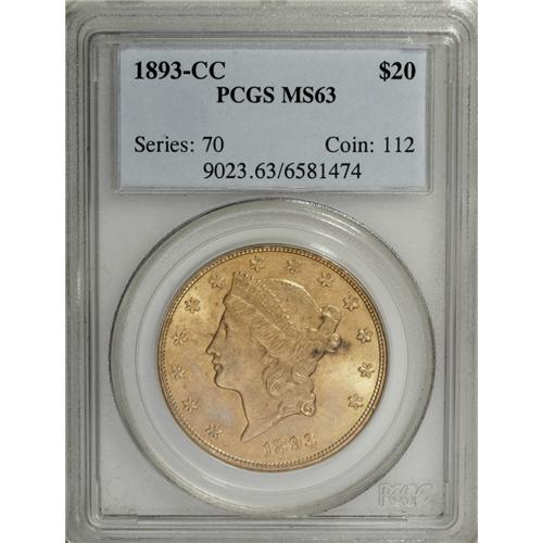 <B>1893-CC $20 MS63 PCGS.</B></I> This Select quality double eagle is from the Carson City Mint's final issue. It seems very nice for the grade, and not "market-graded". The shimmering satiny luster and yellow-gold toning, with peach highlights, is very attractive. Most numismatists would rate this as a well struck piece, despite a hint of weakness on some the design's highest points. A faint smudge mark on the back of and just behind Liberty's hair bun is probably from a speck of grease on the die at the time of striking. "Choice examples are very scarce, and only one coin has been certified at the MS-64 level," according to Garrett and Guth's <I>Encyclopedia of U.S. Gold Coins.</B></I> Population: 18 in 63, 0 finer (11/06).<BR><I>From The Kutasi Collection.</B></I><BR><BR><b>Shipping:</b> Coin/Currency (<a target="_blank" href="http://www.heritageauctions.com/common/shipping.php">view shipping information</a>)