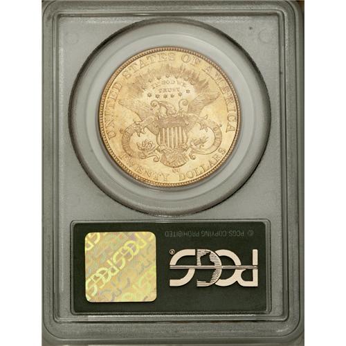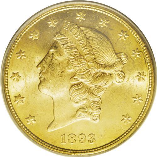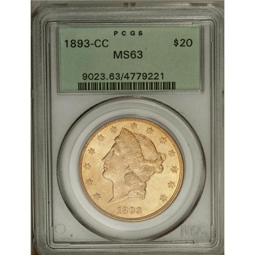 <B>1893-CC<$20> MS63 PCGS.</B></I> This is the final year of issue for the Carson City Mint, and the present example is tied for the finest of this date that PCGS has ever certified. The popularity of this issue is enhanced by its low mintage of just 18,402 coins. This is an attractive example that has frosty luster and sharp design elements. Both sides have rich orange-gold color, and few abrasions other than the usual scattered marks that are consistent with the grade. Both Rusty Goe and Doug Winter agree that this is an excellent choice for type collectors. Winter commented: "The 1893-CC is found with better overall eye appeal than most Carson City double eagles, making it a popular choice as a type coin. While most are rather extensively abraded, it is possible to find an appealing piece with good color and luster as well as a sharp strike." Here is just such a piece that meets these comments. Date collectors and type collectors may have to battle each other to acquire this splendid specimen. Population: 18 in 63, 0 finer (7/06).