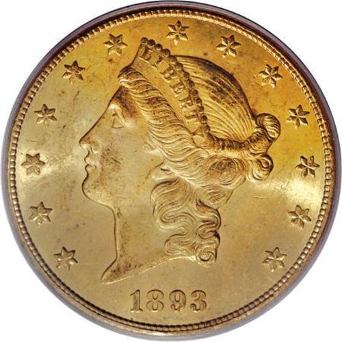 <B>1893-CC $20 MS63 PCGS.</B></I> The final issue of the Carson City Mint, this double eagle is a lovely representative with its frosty luster and excellent yellow-gold coloration. The surfaces have a few typical bagmarks and other abrasions that are consistent with the grade. It is sharply struck in nearly every detail, with only slight weakness evident along the beads at the top of the crown over LIBERTY.<BR> In addition to its excellent aesthetic appeal, it is also a condition rarity, one of the finest examples available to the current generation of collectors. While NGC has certified a single coin at a higher grade, this piece is tied for the best that PCGS has graded. Population: 18 in 63, 0 finer (8/07).<BR><BR><B>Coin Engraver:</B> James B. Longacre<BR><BR><b>Shipping:</b> Coins & Currency (<a target="_blank" href="http://www.heritageauctions.com/common/shipping.php">view shipping information</a>)