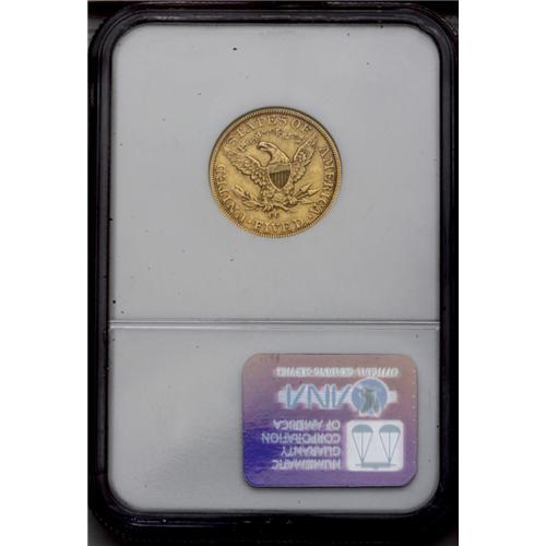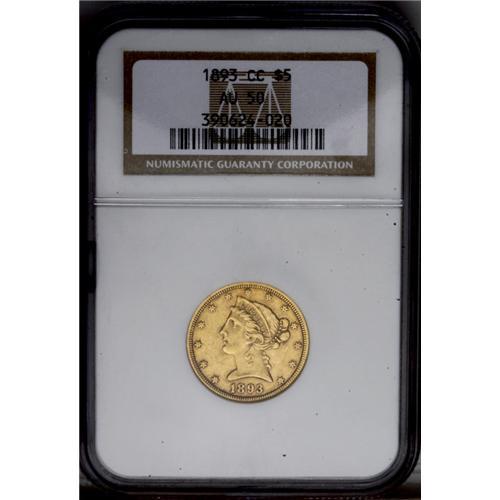 <B>1893-CC<$5> AU50 NGC.</B></I> Semi-bright honey-gold surfaces are minimally abraded, and the design features display nice definition. Overall, a pleasing AU example of this final Carson City half eagle.<BR><I>From The Steve Glenn Collection.</B></I> <BR><BR><B>Important notice:</B> Heritage usually auctions material at the rate of 200-250 lots per hour. On some occasions eBay Live bid software or the Internet may not be able to keep up with the pace of the auction. We recommend placing a realistic absentee bid now as insurance to avoid disappointment. Occasionally the auctioneer may eliminate or reject an eBay Live bid, and the auctioneer may also reopen a lot after the close of the eBay live bidding (usually because we missed an audience bid), and may reject your bid even if it shows you as the winning bidder. By bidding via eBay Live, you agree that Heritage may award the lot to another bidder at its sole discretion under the circumstances described above or any other reasonable circumstances. Since eBay bids are not shown to us until we open the lot on the floor, we treat those bids just like floor bids. In most cases the floor responds before the eBay bid is presented to us, due to Internet lag time, so for consistency we have made it a policy that floor bids are always considered first over tie eBay live bids. Also please note that all Heritage lots purchased through eBay Live carry a 20% Buyer's Premium. Please make sure you read the Terms and Conditions before you bid. This lot is being auctioned in conjunction with a live floor auction by Heritage Galleries & Auctioneers. All final auction and invoice information will be supplied by Heritage Galleries & Auctioneers, and all other information should be considered preliminary. Lot:2831 <BR><BR><B>Winning Notification and Billing:</B> After the FINAL session in this auction is complete, Heritage will send e-mail and snail mail invoices. This process normally takes several days. All final auction and invoice information will be supplied by Heritage Galleries & Auctioneers, and all other information should be considered preliminary. <BR><BR>This auction will be conducted on a live auction floor and over the Internet through eBay Live. If you choose to place an absentee bid, please take a moment to <font color='#0000ff'><u><a href='http://pages.ebay.com/liveauctions/help/before/laabsentee.html'>learn how eBay Live absentee bidding works</a></u></font><font color='#000000'>