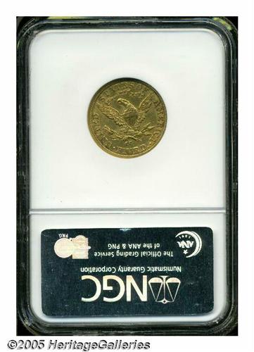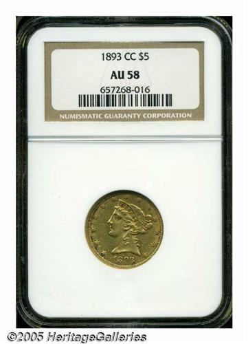 <B>1893-CC<$5> AU58 NGC.</B></I> A pleasing example of the final Carson City Half Eagle, struck during the last year of operations at that Mint. The surfaces have nearly complete yellow-gold luster with dark verdigris visible on both sides.
