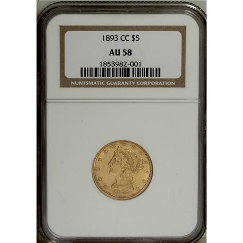 <B>1893-CC $5 AU58 NGC.</B></I> A suitably struck and appealing yellow-gold example from the final year of the Carson City Mint. The highly lustrous surfaces exhibit light abrasions and a degree of highpoint friction.<BR><BR><b>Shipping:</b> Coins & Currency (<a target="_blank" href="http://www.heritageauctions.com/common/shipping.php">view shipping information</a>)