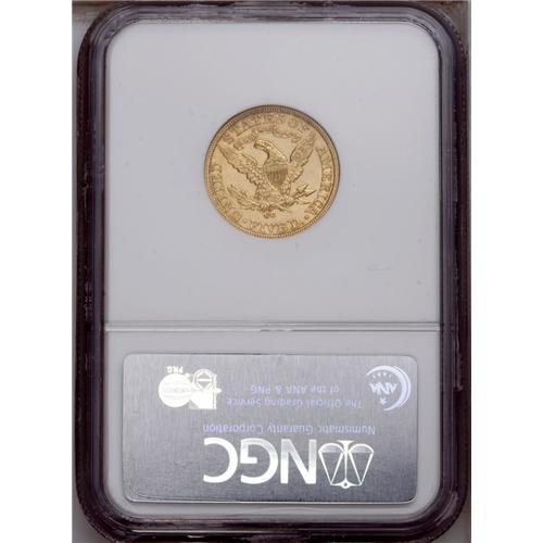 <B>1893-CC $5 AU58 NGC.</B></I> Satiny yellow-gold surfaces with a trace of orange color on the reverse. Lightly abraded surfaces as usually seen. The mintmark was punched into the die one letter at a time. The result is that the first C is low and leans slightly to the left with an upright second C.