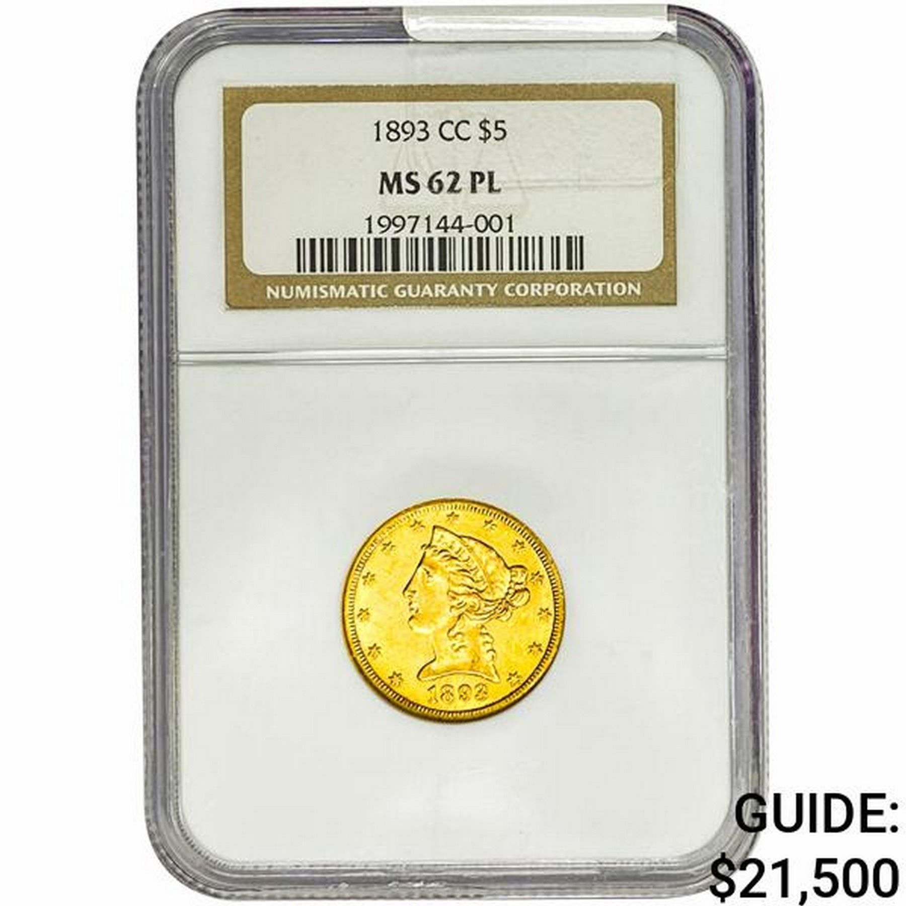 1893-CC $5 Gold Half Eagle NGC MS62 PL