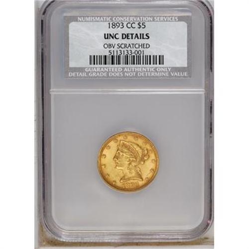<B>1893-CC $5 --Obverse Scratched--NCS. Unc Details.</B></I> NGC Census: (12/142). PCGS Population (6/54). Mintage: 60,000. Numismedia Wsl. Price for NGC/PCGS coin in MS60: $1,250. (#8384)<BR><BR><B>Coin Engraver:</B> Christian Gobrecht<BR><BR><b>Shipping:</b> Coins & Currency (<a target="_blank" href="http://www.heritageauctions.com/common/shipping.php">view shipping information</a>\)