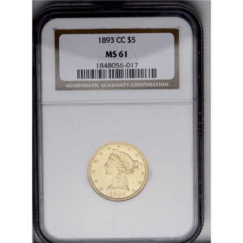 <B>1893-CC<$5> MS61 NGC.</B></I> Variety 1-A. The first C in the mintmark is positioned lower than the second on this die pairing. This issue is popular as the final year of mintage at the legendary Carson City Mint. This lovely honey-gold piece, despite a few abrasions on Liberty and elsewhere, is well struck and appears conservatively graded. Census: 38 in 61, 78 finer (4/06).<BR><I>From The Lewis (Tahoe) Collection.</B></I>