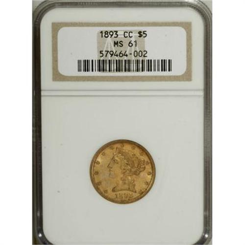 <B>1893-CC $5 MS61 NGC.</B></I> Lustrous with appealing peach and steel-green coloration and consistently bold striking details. A fair number of superficial marks define the grade of the piece. Final year of coinage at the Carson City Mint, and always a popular issue for type purposes. <BR><BR><b>Shipping:</b> Coins & Currency (<a target="_blank" href="http://www.heritageauctions.com/common/shipping.php">view shipping information</a>)