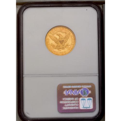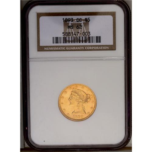<B>1893-CC<$5> MS62 NGC.</B></I> Variety 1-A. The final year of Carson City production for both silver and gold issues and one of only 60,000 half eagles struck. Although not particularly scarce in grades up to AU58, the availability of true Mint State pieces is far outstripped by the demand. The presently offered specimen must have barely missed an MS63 rating, for it is especially clean for the assigned grade and blessed with superior luster and color. Census: 48 in 62, 29 finer (5/06).