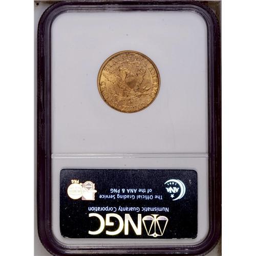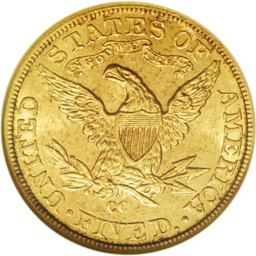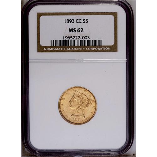 <B>1893-CC<$5> MS62 NGC.</B></I> Variety 1-A. This pairing is characterized by the first C positioned lower than the second one. Sharply defined throughout, the surfaces are bright with rich satiny luster and a reddish-orange appearance. Numerous small luster grazes are scattered about each side, accounting for the grade. A very scarce date which becomes increasingly rare at higher grade levels. Census: 47 in 62, 29 finer (3/06). <BR><BR><B>Important notice:</B> Heritage usually auctions material at the rate of 200-250 lots per hour. On some occasions eBay Live bid software or the Internet may not be able to keep up with the pace of the auction. We recommend placing a realistic absentee bid now as insurance to avoid disappointment. Occasionally the auctioneer may eliminate or reject an eBay Live bid, and the auctioneer may also reopen a lot after the close of the eBay live bidding (usually because we missed an audience bid), and may reject your bid even if it shows you as the winning bidder. By bidding via eBay Live, you agree that Heritage may award the lot to another bidder at its sole discretion under the circumstances described above or any other reasonable circumstances. Since eBay bids are not shown to us until we open the lot on the floor, we treat those bids just like floor bids. In most cases the floor responds before the eBay bid is presented to us, due to Internet lag time, so for consistency we have made it a policy that floor bids are always considered first over tie eBay live bids. Also please note that all Heritage lots purchased through eBay Live carry a 20% Buyer's Premium. Please make sure you read the Terms and Conditions before you bid. This lot is being auctioned in conjunction with a live floor auction by Heritage Galleries & Auctioneers. All final auction and invoice information will be supplied by Heritage Galleries & Auctioneers, and all other information should be considered preliminary. Lot:2833 <BR><BR><B>Winning Notification and Billing:</B> After the FINAL session in this auction is complete, Heritage will send e-mail and snail mail invoices. This process normally takes several days. All final auction and invoice information will be supplied by Heritage Galleries & Auctioneers, and all other information should be considered preliminary. <BR><BR>This auction will be conducted on a live auction floor and over the Internet through eBay Live. If you choose to place an absentee bid, please take a moment to <font color='#0000ff'><u><a href='http://pages.ebay.com/liveauctions/help/before/laabsentee.html'>learn how eBay Live absentee bidding works</a></u></font><font color='#000000'>
