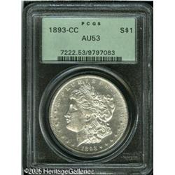 <B>1893-CC<img border='0' src='http://www.heritagecoins.com/images/star.gif' width=10 height=10>$1 AU53 PCGS.</B></I> Softly detailed above the ear, and on the eagle's breast, with untoned, semi-prooflike surfaces that are typically worn, for the grade, and have a few noticeable abrasions on both obverse and reverse. A low mintage and final-year Carson City issue. Lot:10414