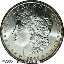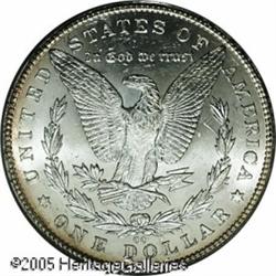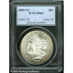 <B>1893-CC<img border='0' src='http://www.heritagecoins.com/images/star.gif' width=10 height=10>$1 MS63 PCGS.</B></I> Boldly struck with a bit of golden peripheral toning that confirms the originality of this well frosted, final year Carson City Dollar. Mostly inoffensive abrasions are confined to the facial area and to the left obverse field. Lot:10416