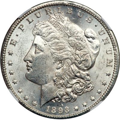 1893-CC Morgan Dollar. NGC graded MS-61. An important date in the Carson City mint series. An estimated survival rate of only 48,935 pieces. Lustrous and almost devoid of any color. A very pleasing example of this scarce date.