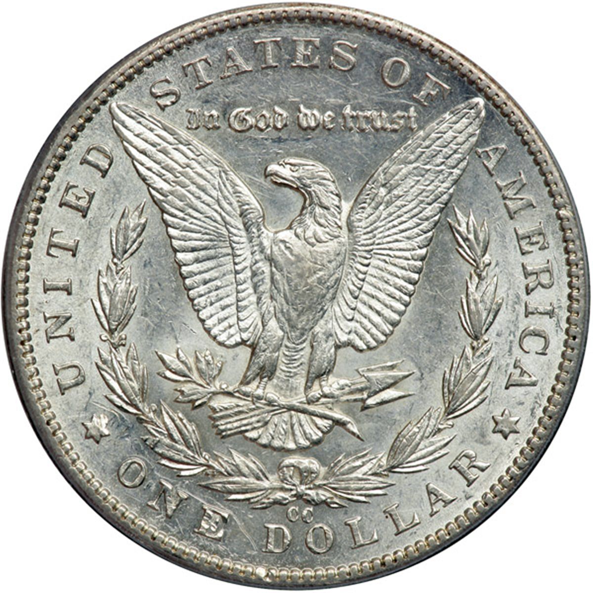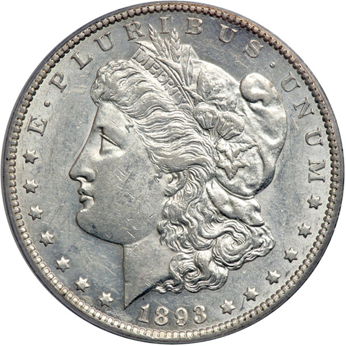 1893-CC Morgan Dollar. PCGS graded AU-55. Untoned with plenty of mint luster present. This is the last year the government struck coinage at the mint in Carson City, Nevada. Only silver dollars, half eagles, eagles, and double eagles were made bearing the 1893-CC combination. Attractive and well preserved (PCGS # 7222) .