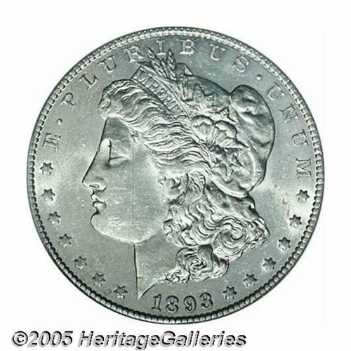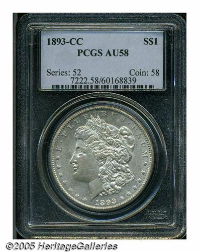 <B>1893-CC<S$1> AU58 PCGS.</B></I> Unusually well defined over the centers, the surfaces reveal little evident wear. The luster is bright and frosty, and there are no more than the expected number of abrasions for this lightly circulated Silver Dollar.