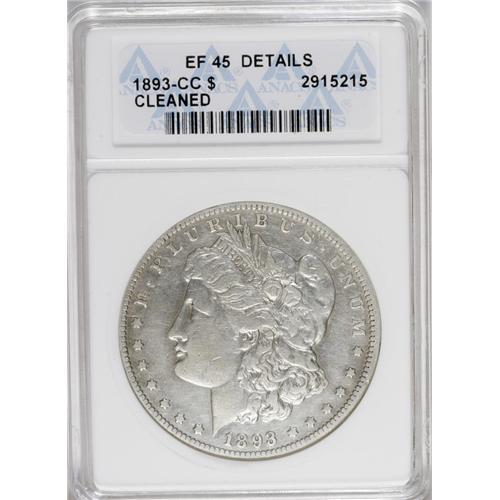 <B>1893-CC S$1 --Cleaned--ANACS. XF45 Details.</B></I> Lightly worn and softly struck, this silver-gray piece has just a few small traces of original luster in the protected areas. A significant piece from the final year of the Carson City Mint.<BR><BR><b>Shipping:</b> Coin/Currency (<a target="_blank" href="http://www.heritageauctions.com/common/shipping.php">view shipping information</a>)