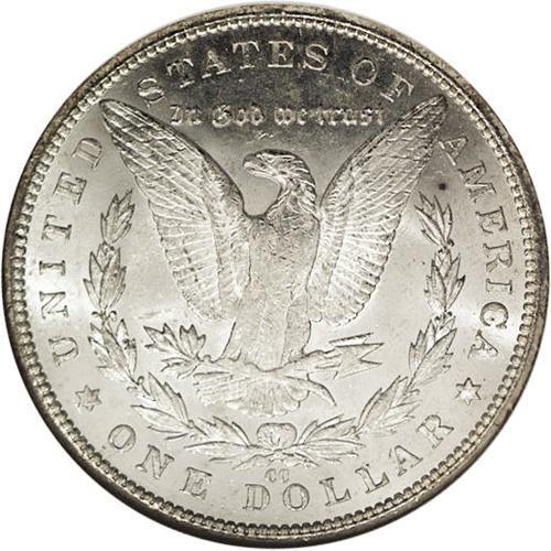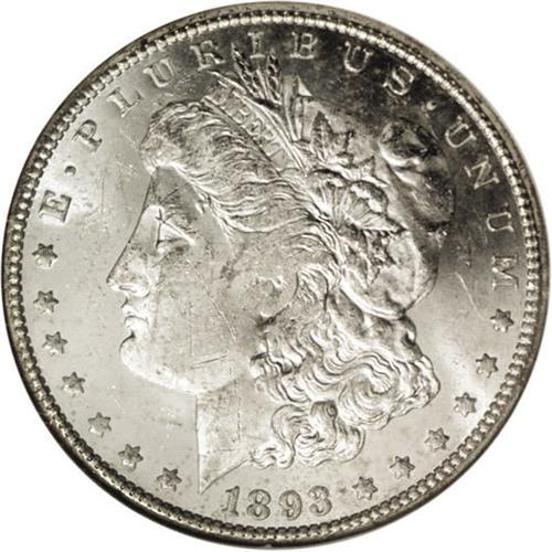<B>1893-CC<img border='0' src='http://www.heritagecoins.com/images/star.gif' width=10 height=10>$1> MS60 NGC.</B></I> This flashy example of this elusive CC-mint dollar has a whisper of gold toning, with somewhat prooflike fields. A single tiny dark spot is noted beneath the M in AMERICA. The centers exhibit weakness characteristic of the issue, and the portrait is typically abraded, but the fields are relatively clean and the luster is superb for the grade.