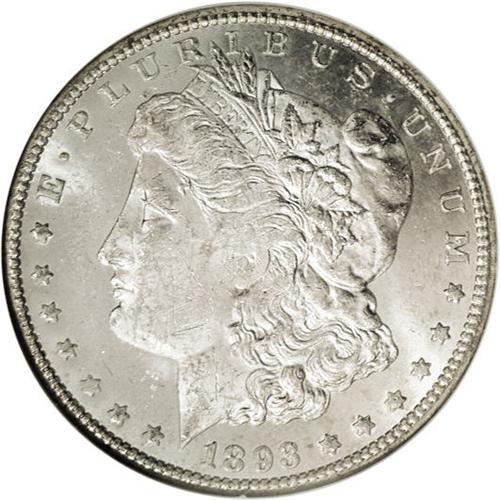 <B>1893-CC<img border='0' src='http://www.heritagecoins.com/images/star.gif' width=10 height=10>$1> MS60 NGC.</B></I> This flashy tough date CC-mint dollar has a whisper of gold toning, and a single tiny spot beneath the M in AMERICA. The centers exhibit weakness characteristic of the issue, and the portrait is typically abraded, but the fields are relatively clean and the luster is exceptional for the grade.