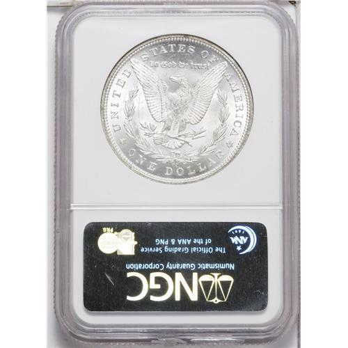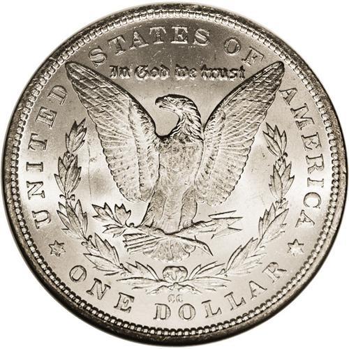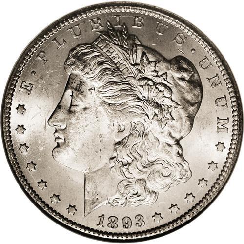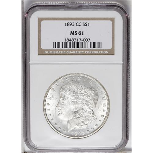 <B>1893-CC<img border='0' src='http://www.heritagecoins.com/images/star.gif' width=10 height=10>$1> MS61 NGC.</B></I> The 1893-CC is the third and last of the great Morgan dollar CC-mint key dates. This example displays numerous ticks, reeding marks, and abrasions that are unfortunately concentrated on Liberty's face and neck, and to a lesser extent in the left obverse field. On the positive side, the surfaces are untoned and brilliant, with excellent cartwheel luster. The reverse offers fairly good cameo contrast, with relatively few mentionable distractions--save for a pinscratch in the left field between the wreath and the eagle--and taken on its own would likely grade two points higher. A wispy light die crack connects the two C's in the mintmark.
