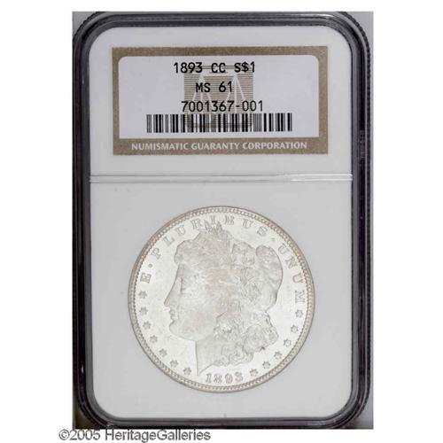 <B>1893-CC<S$1> MS61 NGC.</B></I> The '93-CC has always been a collectors' favorite due to its scarcity and its position as the last Carson City Mint coin of its denomination. In terms of availability in Mint State, David Bowers (1993) writes that "it is third rarest after 1889-CC (rarest) and 1879-CC." This piece displays faint tan color on portions of the Liberty and eagle motifs and around the rims. The fields are somewhat prooflike, and establish a mild contrast with the design elements. Strike weakness is apparent on the hair over Liberty's ear and on the eagle's breast. This relatively attractive coin would grade higher were it not for the luster grazes and scuffs on Liberty's cheek and neck and in the left (facing) obverse field.