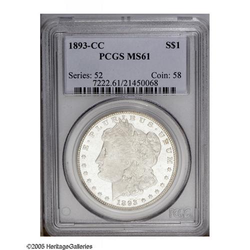 <B>1893-CC<S$1> MS61 PCGS.</B></I> Lustrous, pleasing semi-prooflike surfaces on this appealing coin. Liberty's cheek is clean but the coin is flatly struck on the highpoints and both sides show roller marks, as struck. From the last year of the Carson City Morgan dollars. <BR><BR><B>Important n