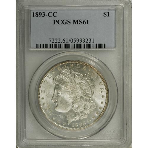 <B>1893-CC S$1 MS61 PCGS.</B></I> The final year of Carson City production, and a prized date for the dollar collector. This is a frosty, well struck example with some light contact marks in the left obverse field.<BR><BR><b>Shipping:</b> Coin/Currency (<a target="_blank" href="http://www.heritageauctions.com/common/shipping.php">view shipping information</a>)