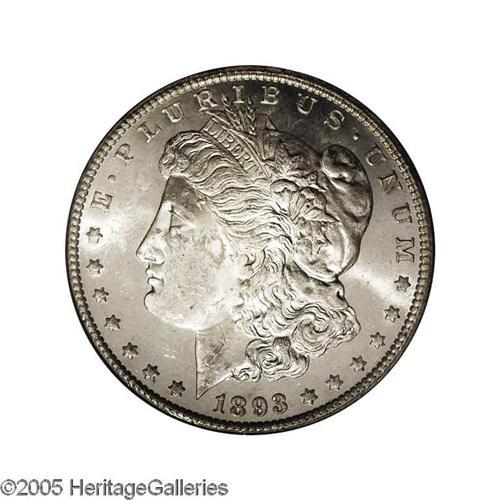 <B>1893-CC<S$1> MS62 PCGS.</B></I> A bold, frosty-white example with scattered contact marks and appealing cartwheel brilliance. A rather low (by Morgan Dollar standards) 677,000 pieces were struck in the Carson City Mint's final year.