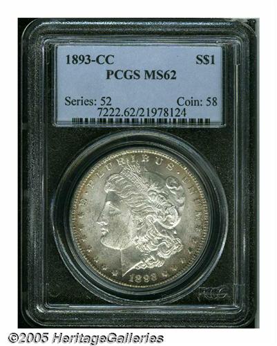 <B>1893-CC<S$1> MS62 PCGS.</B></I> This is a gorgeous example of the date with just a few too many marks on the obverse for a higher grade. Alternately, the reverse is outstanding and grades at least a point higher if not two points finer. Both sides have light and attractive gold toning at the borders. The advanced collector will certainly appreciate the opportunity to acquire this example.<BR><I>From The Empire State Collection, Part Two.</B></I>