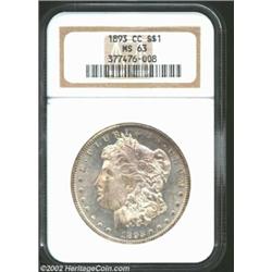 1893-CC S$1 MS63 NGC. A lovely example of this key Morgan issue, this piece is somewhat weakly defin