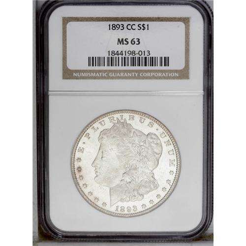 <B>1893-CC<img border='0' src='http://www.heritagecoins.com/images/star.gif' width=10 height=10>$1> MS63 NGC.</B></I> Flashy cartwheel luster throughout with a trace of gold peripheral toning. The central strike is weak on Liberty's hair and the eagle's chest, a common feature on this date and mint. Always in strong demand by date collectors as well as Carson City collectors as this is the final year of issue and the last year of coinage from that Mint. <BR><BR><B>Important notice:</B> Heritage usually auctions material at the rate of 200-250 lots per hour. On some occasions eBay Live bid software or the Internet may not be able to keep up with the pace of the auction. We recommend placing a realistic absentee bid now as insurance to avoid disappointment. Occasionally the auctioneer may eliminate or reject an eBay Live bid, and the auctioneer may also reopen a lot after the close of the eBay live bidding (usually because we missed an audience bid), and may reject your bid even if it shows you as the winning bidder. By bidding via eBay Live, you agree that Heritage may award the lot to another bidder at its sole discretion under the circumstances described above or any other reasonable circumstances. Since eBay bids are not shown to us until we open the lot on the floor, we treat those bids just like floor bids. In most cases the floor responds before the eBay bid is presented to us, due to Internet lag time, so for consistency we have made it a policy that floor bids are always considered first over tie eBay live bids. Also please note that all Heritage lots purchased through eBay Live carry a 20% Buyer's Premium. Please make sure you read the Terms and Conditions before you bid. This lot is being auctioned in conjunction with a live floor auction by Heritage Galleries & Auctioneers. All final auction and invoice information will be supplied by Heritage Galleries & Auctioneers, and all other information should be considered preliminary. Lot:3628 <BR><BR><B>Winning Notification and Billing:</B> After the FINAL session in this auction is complete, Heritage will send e-mail and snail mail invoices. This process normally takes several days. All final auction and invoice information will be supplied by Heritage Galleries & Auctioneers, and all other information should be considered preliminary. <BR><BR>This auction will be conducted on a live auction floor and over the Internet through eBay Live. If you choose to place an absentee bid, please take a moment to <font color='#0000ff'><u><a href='http://pages.ebay.com/liveauctions/help/before/laabsentee.html'>learn how eBay Live absentee bidding works</a></u></font><font color='#000000'>