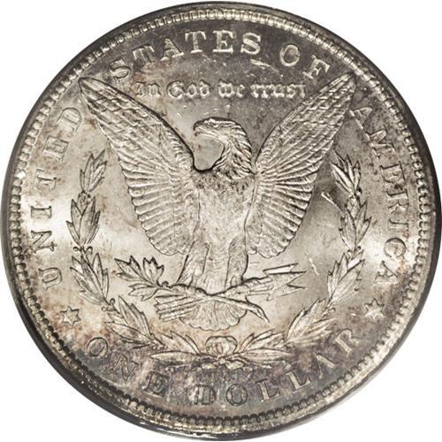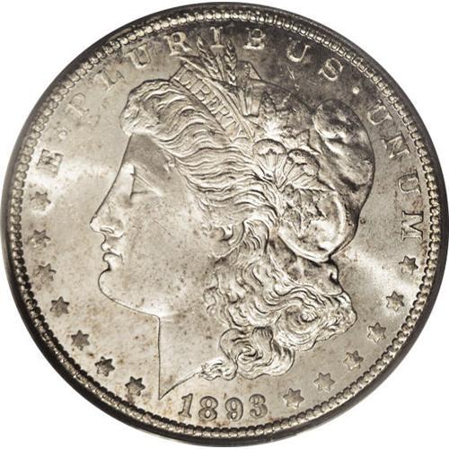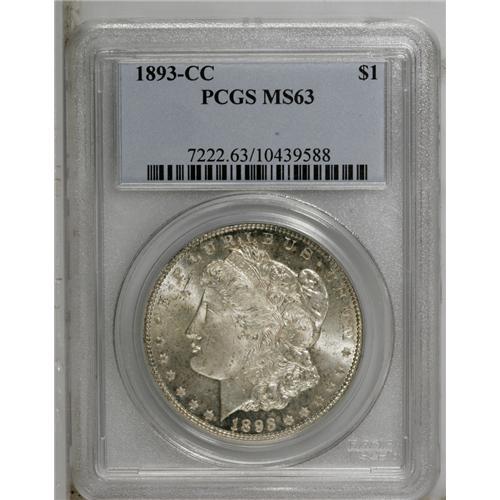 <B>1893-CC<img border='0' src='http://www.heritagecoins.com/images/star.gif' width=10 height=10>$1> MS63 PCGS.</B></I> A light peripheral tinge of gold and ice-blue on the obverse complements the reverse that is more luxuriantly toned, adding mauve and amber to the same color palette, with silver centers on each side. The luster is brilliant, and the strike is typical for the issue. A few light abrasions on Liberty account for the grade, but the eye appeal is high, especially for lovers of original toning.