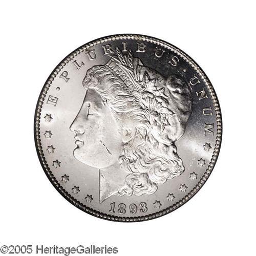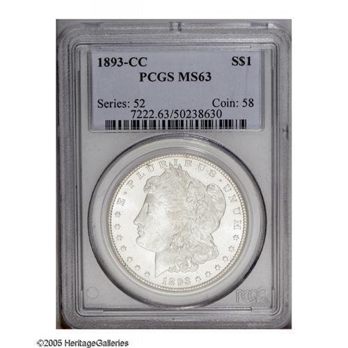 <B>1893-CC<S$1> MS63 PCGS.</B></I> Although typical central weakness is visible on both sides, this is a lovely Mint State example with brilliant silver surfaces and nary a trace of toning. A few minor bagmarks and other blemishes keep this from a higher grade. The devices are highly lustrous with brilliant white mint frost, and they are surrounded by satiny, slightly prooflike fields. A lovely and highly desirable example.
