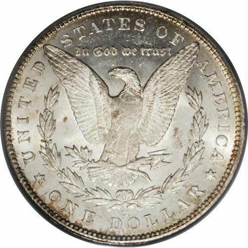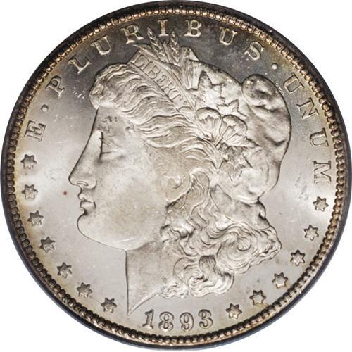 <B>1893-CC<img border='0' src='http://www.heritagecoins.com/images/star.gif' width=10 height=10>$1> MS63 PCGS.</B></I> An outrageously nice example of this important date, with stark contrast between the fields and significantly frosted devices. The surfaces are lustrous and silver, the peripheral areas gently toned to a handsome, harvest golden color. Notable strike weakness shows at the centers of each side, this being the grade-limiting factor.