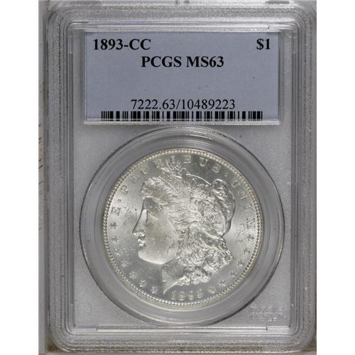<B>1893-CC<img border='0' src='http://www.heritagecoins.com/images/star.gif' width=10 height=10>$1> MS63 PCGS.</B></I> Bowers comments cogently of this issue: "A piece MS-63 or finer, with <I>minimum bagmarks</B></I> is a numismatic find and is very special." Herewith we present exactly such a coin, with brilliant luster, minimal bagmarks, and indeed few distractions of any kind. Both dies show evidence of fatigue, in the form of many fine die cracks and multiple clashes. The overall appearance is quite high-end for the grade.