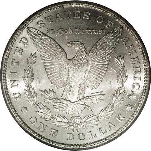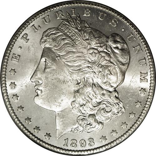 <B>1893-CC<img border='0' src='http://www.heritagecoins.com/images/star.gif' width=10 height=10>$1 MS63 PCGS.</B></I> Brilliant, highly lustrous, and somewhat prooflike. A typically struck example that has a few luster grazes on the cheek. The reverse is well preserved, as is the obverse field.