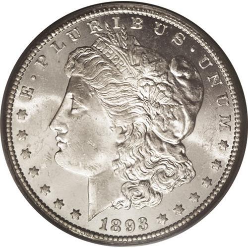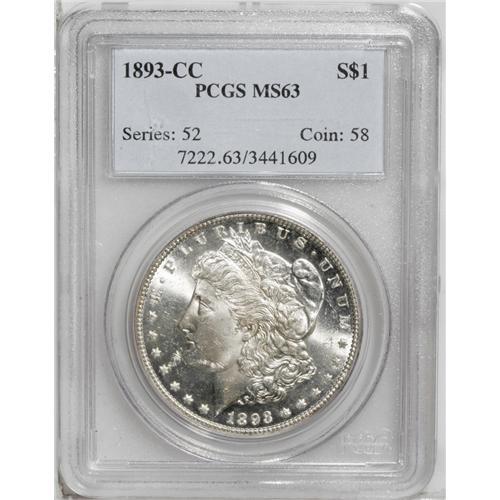 <B>1893-CC<img border='0' src='http://www.heritagecoins.com/images/star.gif' width=10 height=10>$1> MS63 PCGS.</B></I> From the final year of the Carson City Mint, this Select dollar has great luster and a solid strike for this issue. A few marks in the fields and a couple luster grazes on the devices partially account for the grade. Excellent eye appeal for this semi-key date.