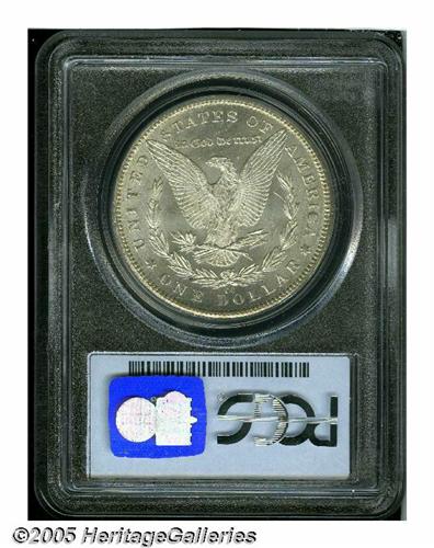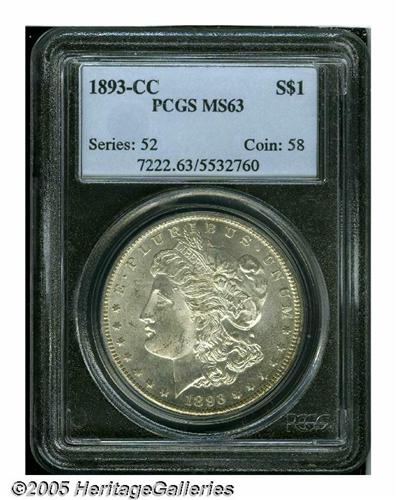 <B>1893-CC<S$1> MS63 PCGS.</B></I> The devices are frosty and the fields are satiny. Both surfaces are essentially brilliant with just a whisper of pale gold. Virtually all design features are boldly and deeply defined including Liberty's hair tresses. The 1893-CC is notable as the last dollar issue coined at the Carson City Mint. The mintage of 677,000 pieces is low by Morgan dollar standards, and survivors are eagerly sought in all grades.