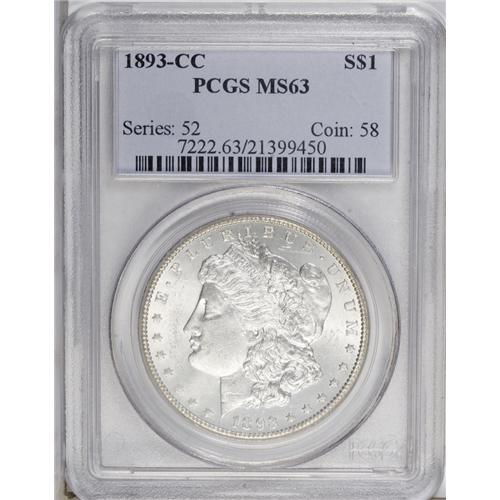 <B>1893-CC S$1 MS63 PCGS.</B></I> Third-rarest of the Carson City Morgan dollars is the 1893-CC, after the 1889-CC and 1879-CC. This example is sharply struck, bright, and brilliant, with a somewhat frosty appearance. It is moderately marked on the obverse, but the reverse only shows a few light blemishes. A faint grease streak (as made) connects the stem of the eagle's branch to the upper edge of the wreath.<BR><BR><b>Shipping:</b> Coin/Currency (<a target="_blank" href="http://www.heritageauctions.com/common/shipping.php">view shipping information</a>)
