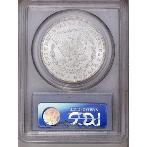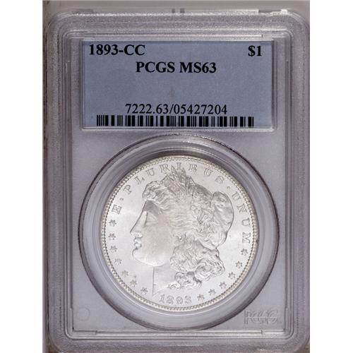 <B>1893-CC<img border='0' src='http://www.heritagecoins.com/images/star.gif' width=10 height=10>$1> MS63 PCGS.</B></I> This virtually stone-white example features bright cartwheel luster, and is well preserved save for the expected faint grazes on the cheek. The reverse is choice for the grade. Both sides show evidence of die clashing. An appealing example of this coveted last-year Carson City issue.